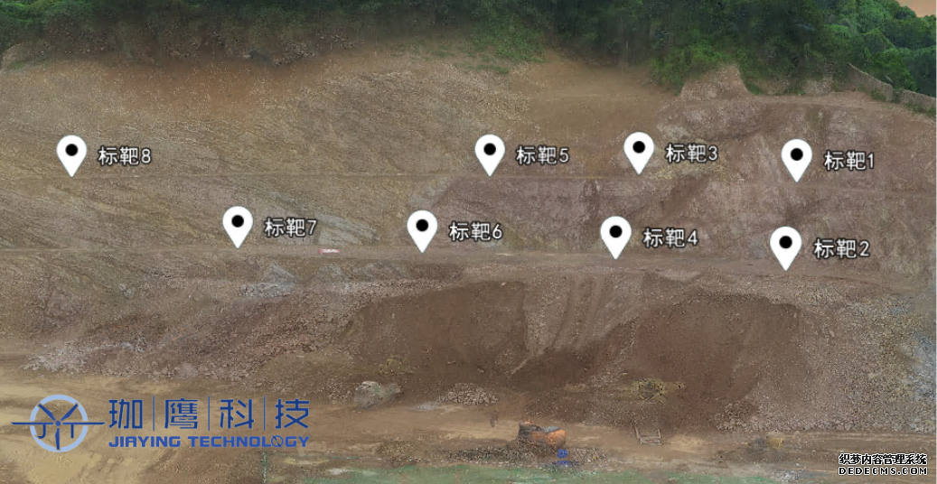 珈鷹的工作人員在滑坡的北部方向安裝了一臺AI視覺監測儀,用于實時監測邊坡的變形情況。在待監測的邊坡上,共布置了8個監測標靶,其中上級馬道布置了4個標靶,下級馬道布置了4個標靶。此外,在滑坡南部上級馬道的穩定巖石上布置1個基準標靶,作為監測的參考基準點。